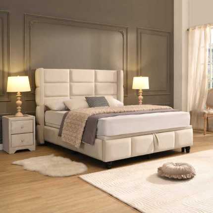 Elevate your bedroom with this elegant upholstered Armagh bed, featuring a smart rectangular panel design across both the headboard and footboard. Finished in a luxurious fabric with a beautiful modern beige tone, it brings a calm, contemporary feel to any space. Practical gas-lift storage beneath the mattress offers generous hidden space, combining refined style with everyday functionality.